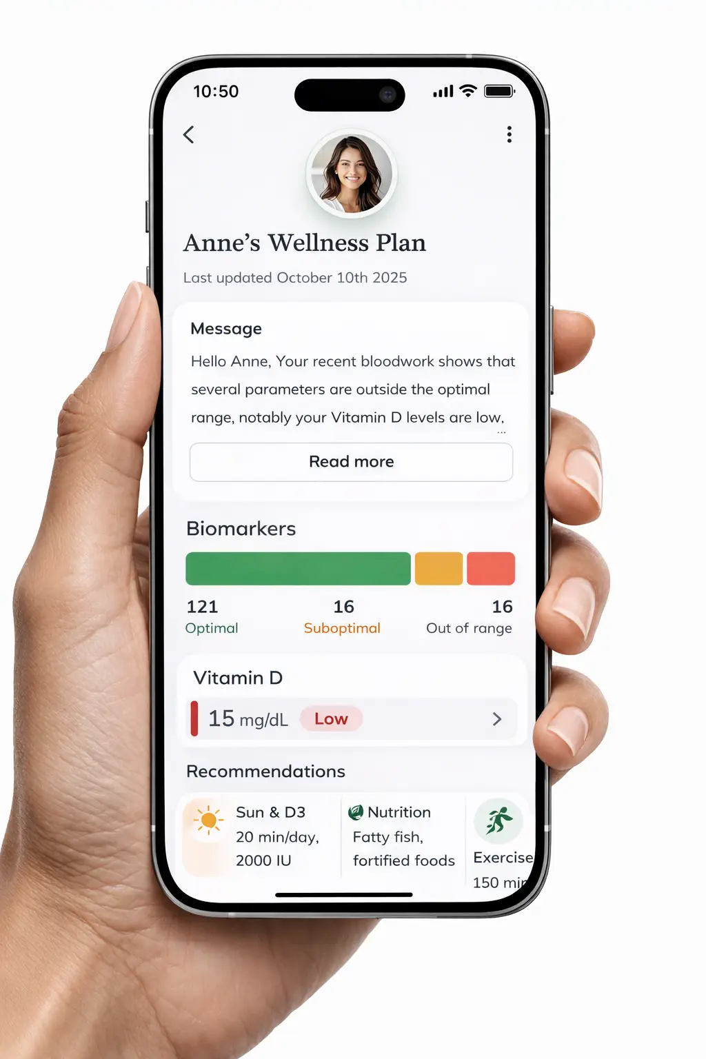 Rather than applying one-size-fits-all recommendations, we use these biomarkers to identify hidden deficiencies, metabolic inefficiencies, and early risk signals—often long before symptoms appear.